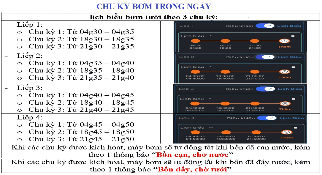+ Chu kỳ tưới toàn vườn tối đa 40 phút thì bồn trung gian sẽ hết nước